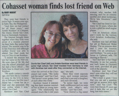 | It started out as a perfectly normal trip to my home... with an extra special trip to visit Ardele, my best girl friend from the time I lived in the Philippines. Little did I know how "different" this trip would end up....... Ardele and I had last seen each other in 1964 when I returned to California after my family's 3 year stint in Subic Bay, Philippines. We had been the best of friends, doing just about everything together. We soon lost contact with each other, but I never forgot her and often asked myself, what she was doing and where she was. As fate would have it, in March, 2001, I decided to look into the homepage of our old school. In it they had a nice guest book and it was fun to read the various entries. Suddenly.... there was her name!! And there was an e-mail address!! I immediately wrote her a mail.... which was soon answered! We had a lot of keeping up to do! As every year, I was planning my usual trip to visit my parents. Normally I flew over in January/February, but this year I had decided on September. And, since Ardele lived in northern California, I suggested I fly up to meet her! That idea was immeditately accepted and arranged. |