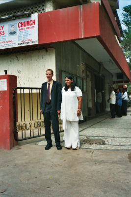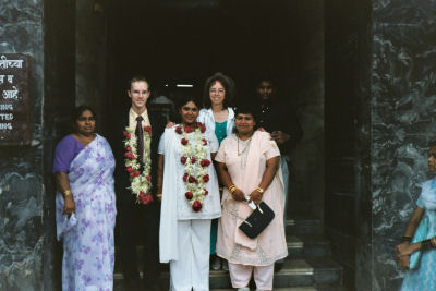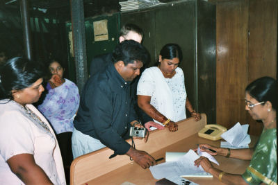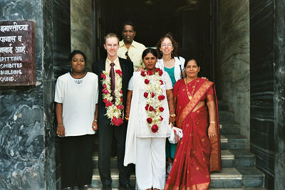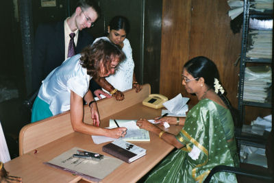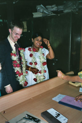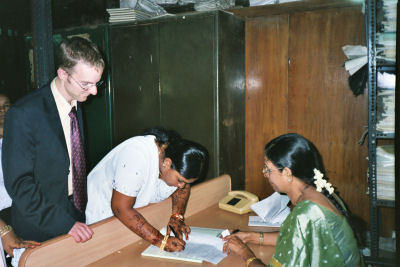 Finally we were lead into the building. The room was small, very dark because of only small, barred windows, and everywhere there were files piled high! Another couple was still at the registrar's desk having their marriage registered and their friends and relatives were also in the room, together with all of us. Then it was our turn. Carsten and Karen sat in front of the registrar's desk, a very nice lady. We gathered around them. Everything took place in English so we had no problem understanding anything. The papers were signed by Carsten and Karen then by witnesses. I acted as a witness for Carsten. I was the only member of our family to attending, so Prithi's husband Xavier acted as Carsten's second witness.