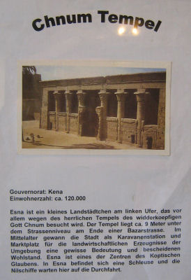 At midnight our ship finally left from Luxor on the first river cruise. Since it was night, we all slept through most of the trip. We docked at Esna, where we walked to our next excursion, the Chnum Tempel. We walked through one of the standard bazaars and, as usual, we were pestered by the many traders trying to sell us their wares.